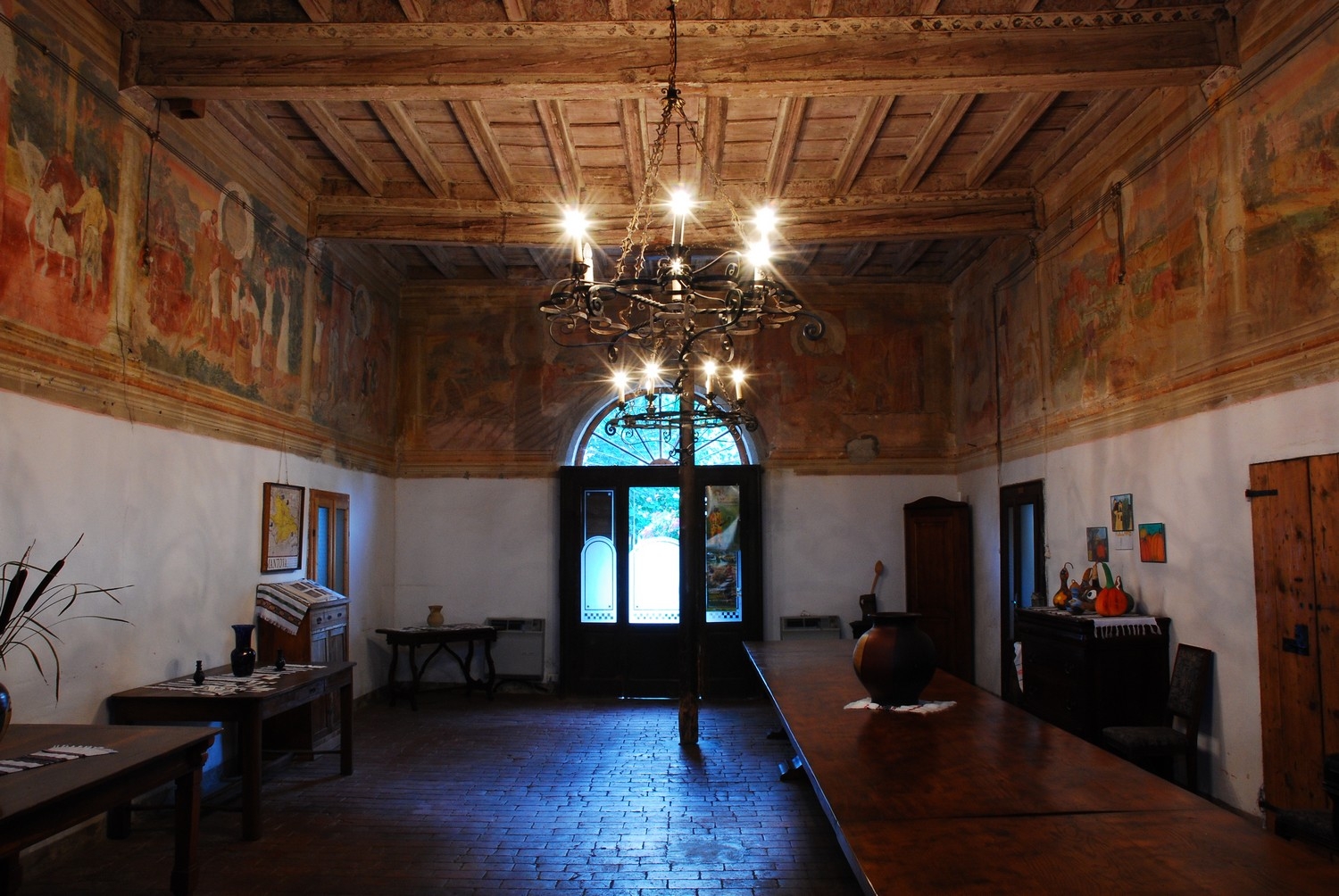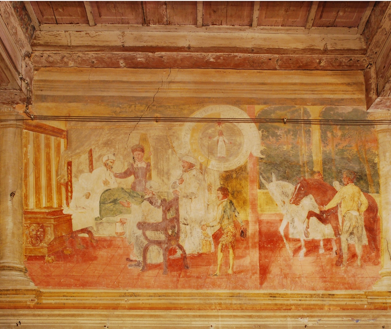 Ogni tondo è adornato da una corona circolare divisa in due parti: nella prima parte si indicata la durata del giorno alla metà del mese, nella seconda parte la durata della notte raffigurata con il crescente lunare e stelle dorate. Entrando nella sala dalla porta sul retro e iniziando dalla parete di sinistra si sviluppano in sequenza i segni dell’acquario, pesci, ariete, toro, gemelli, cancro, leone, vergine, libra, scorpione e sagittario. Sopra le porte d’ingresso verso il retro, si trova la figura di Dio creatore, mentre sopra quella in facciata di Cristo in pietà. L’oratorio realizzato nel 1605 su commissione del nobile Antonio di Agostino della Valle è dedicato a Sant’Antonio Abate. All’esterno, una targa recita DIVO A[NTONIO] HOC SACRU[M] ANTONIUS A VALLE DICA[IT] AN[NO] MDCV. L’edificio ha una facciata scandita da due coppie di lesene tuscaniche con trabeazione spezzata. Il prospetto è concluso da una cimasa a nicchia con frontone curvilineo.