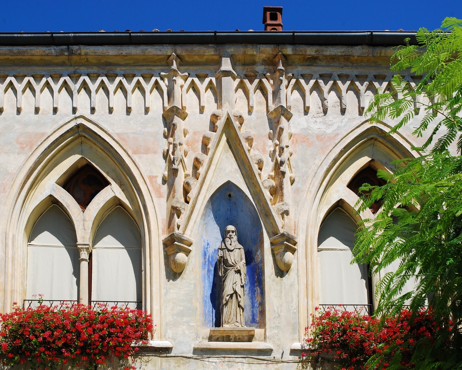 La presenza di un edificio di culto dedicato a San Paolo è documentato dal secolo XII. Il tempio soppresso nel 1798, viene venduto nel 1806, e riadattato ad abitazione privata. Oggi l’edificio si presenta come un compatto volume, ruotato rispetto a via Cavour, con un basso campanile tardogotico. La facciata asimmetrica è scandita da finestre a tutto sesto al piano terra e da bucature ad ogiva al piano primo. Al centro si trovano due bifore ad ogiva poste simmetricamente rispetto ad un’edicola con nicchia. Questa è coronata da una cornice composta da due pinnacoli e da una cuspide. Nell’edicola si trova la statua di San Paolo eremita riferibile al secolo XV, e realizzata in pietra di Vicenza. Il campanile, l’edicola, le due bifore, le cuspidi pensili del cornicione e le paraste ottagonali sembrano riferibili all’originale tempio e databili alla metà del secolo XV; le bucature del piano primo sono di incerta datazione mentre le bucature del piano terra sono dovute agli interventi ottocenteschi.