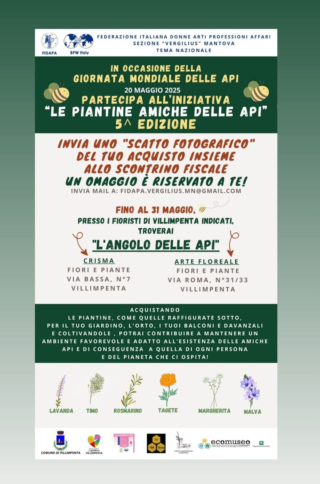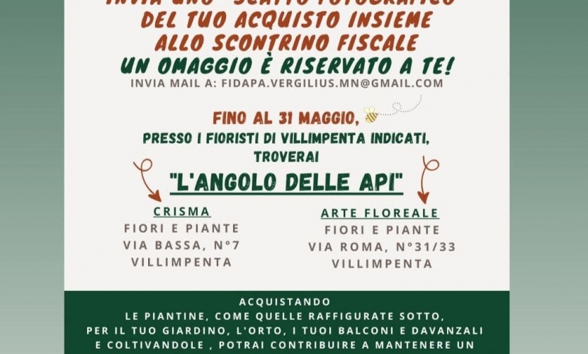 Siamo alla 5^ EDIZIONE della nostra iniziativa "Le piantine amiche delle Api", in collaborazione con il Comune di Villimpenta, Le api di Tamy, Comitato Manifestazioni Villimpentese e le Fioriste sopra citate.