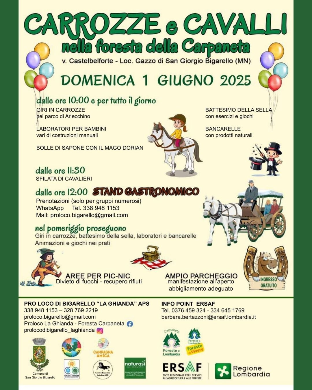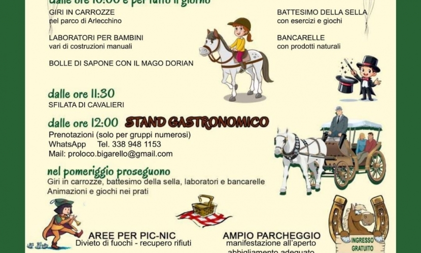 CARROZZEe CAVALLI propone, dalle ore 10:00 e per tutta la giornata, giri in carrozza, attività laboratoriali e stand gastronomici.