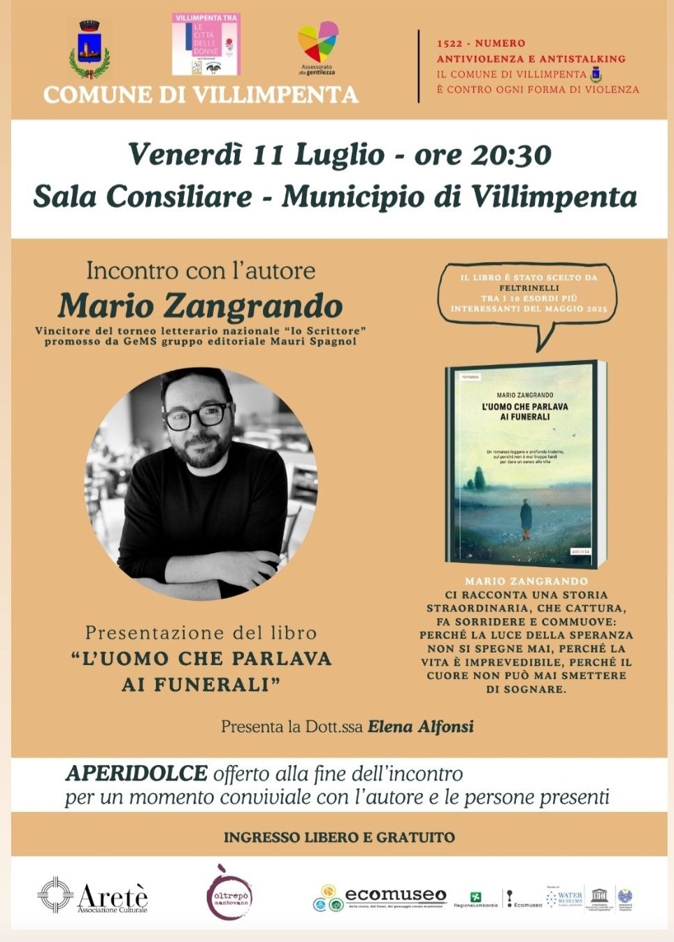 Venerdì 11 luglio alle ore 20.30, nella Sala Consiliare del Municipio di Villimpenta incontreremo Mario Zangrando, autore del romanzo L’uomo che parlava ai funerali.