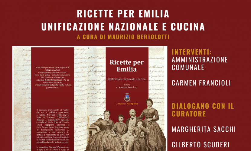 Sabato 7 marzo 2026, alle ore 17:30, presso la Sala Consiliare del Municipio di Villimpenta, si terrà la presentazione del libro “Ricette per Emilia - Unificazione nazionale e cucina” edito dal Comune di Villimpenta in collaborazione con la “Fondazione Francioli Nuvolari” di Villimpenta e curato dal Professore Maurizio Bertolotti.