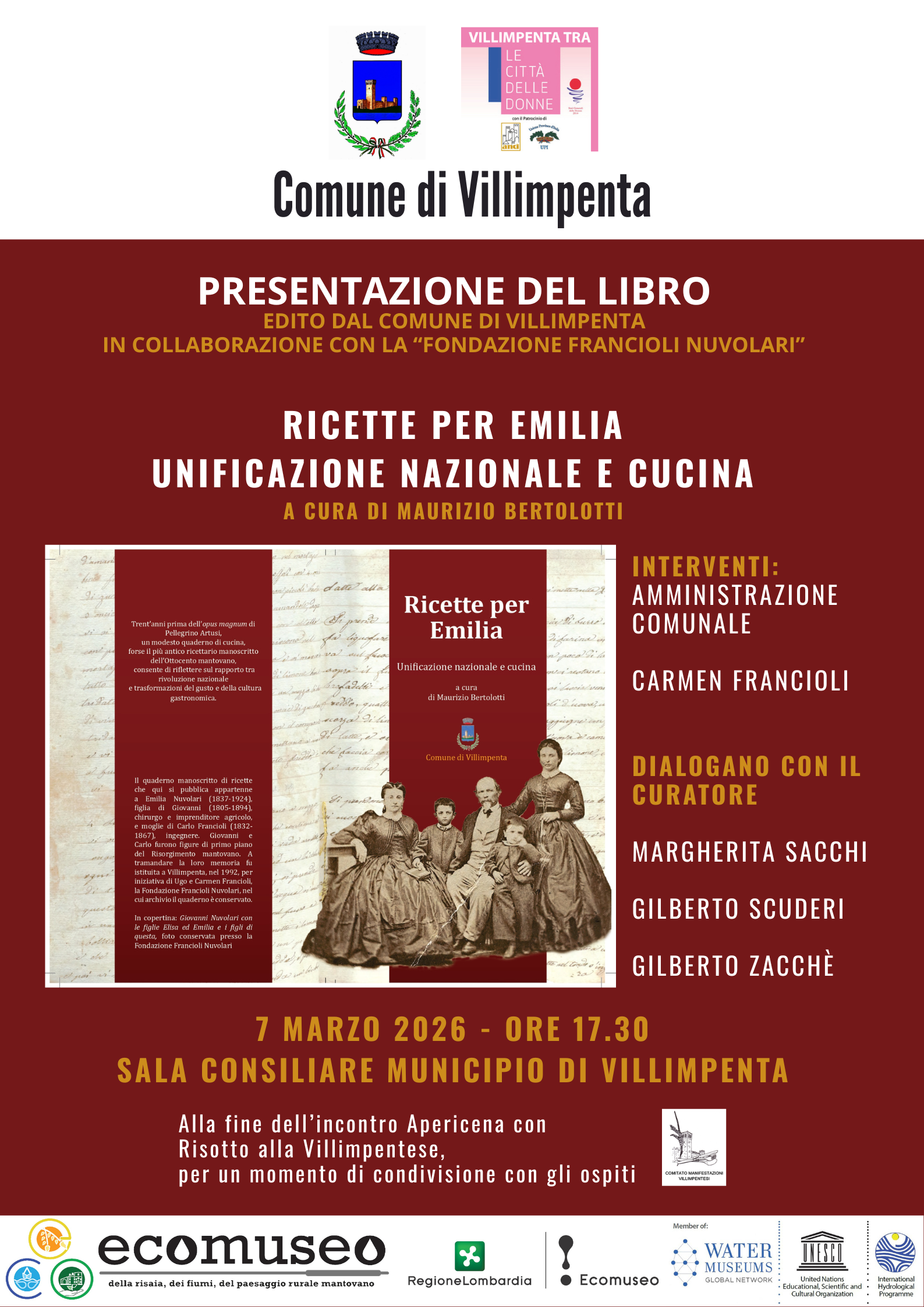 Sabato 7 marzo 2026, alle ore 17:30, presso la Sala Consiliare del Municipio di Villimpenta, si terrà la presentazione del libro “Ricette per Emilia - Unificazione nazionale e cucina” edito dal Comune di Villimpenta in collaborazione con la “Fondazione Francioli Nuvolari” di Villimpenta e curato dal Professore Maurizio Bertolotti.
